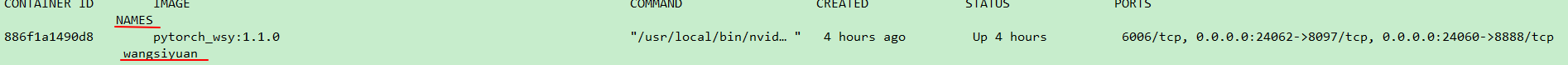 这里我设定我的容器名为:wangsiyuan,容器创建成功后,可以使用docker ps命令,看到如图所示的效果:
