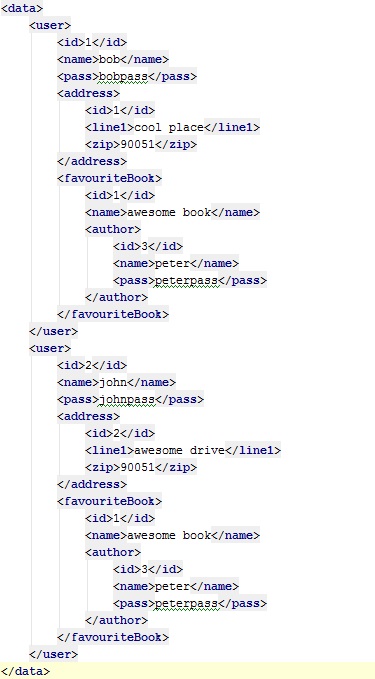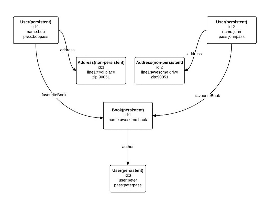In the above example, we see two users. Both have their own Address objects under their "address" property. However if we look at their "favouriteBook" property, we can see that they both re-use the same Book object instance. Also note that the books use the same author.