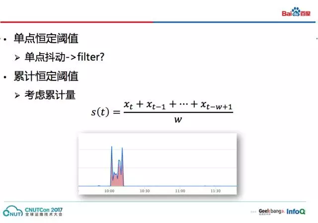 场景一的问题可以使用恒定阈值解决,超过设定阈值就报警。比如拒绝数监控,我们可以设定在一个单位时间内超过 100 个拒绝就报警。但是,实际使用中会出现单点毛刺的问题,也就是一个单点超过阈值的报警。当数据来回抖动时,就会产生大量无效报警。常见方法就是通过 filter 来解决,比如设置为连续 5 个时刻都超过阈值才报警,但这种方法太过僵硬,中间只要有一个点回到阈值范围内就不报。