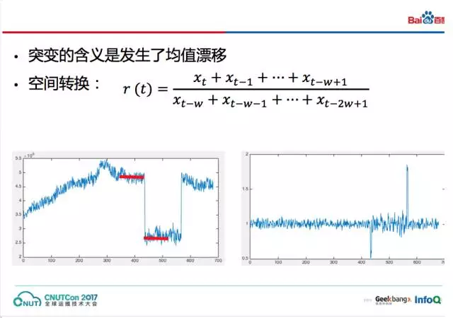 场景二要解决的是突升突降的问题,我们求取数据最近两个窗口的均值变化比例(见上图公式),将原始数据转换到了变化比例空间(r 空间),如右下的小图所示。在 r 空间上设置阈值就可以检测出数据的突升或突降。