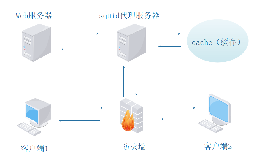当客户端1发送访问请求到防火墙,防火墙会把该用户的请求转发给squid,squid会先检查自身缓存有无相关数据,有的话返回给客户1,如果没有的话,请求web服务器,获取用户的访问内容,放回给用户端,同时自己备份一份数据到自身的缓存中;当客户端2访问和客户端1一样的请求时,由防火墙把请求z'f转发给squid,squid检查自身缓存中有同样的内容,直接将该内容返回给用户。