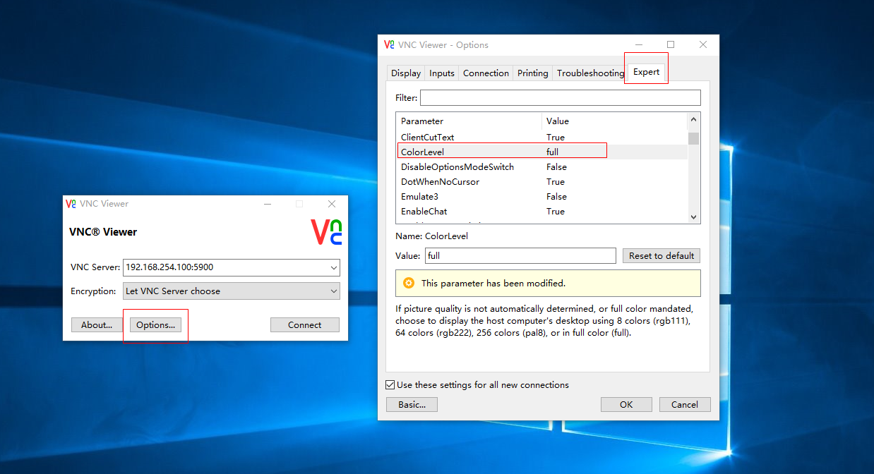 使用VNC客户端可进行连接,如果出现连接闪退现象,修改VNC客户端colorlevel设置为full:
