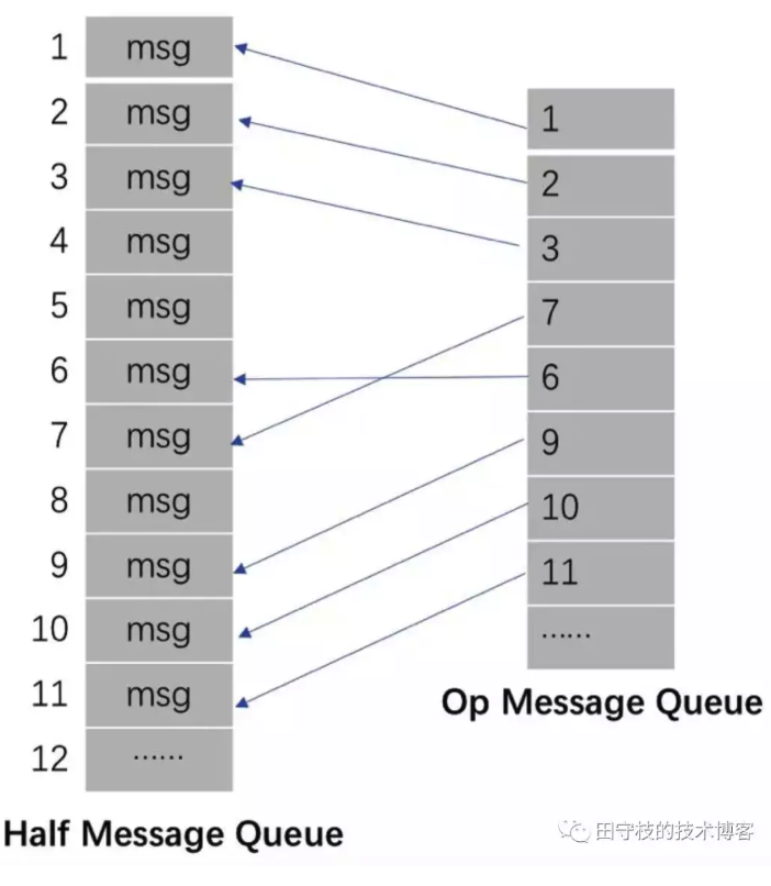 - Half Topic对应队列中存放着prepare消息,就是预发送消息,消息不直接发送到topic,因此消费者对其不可见,实现暂存。