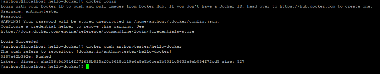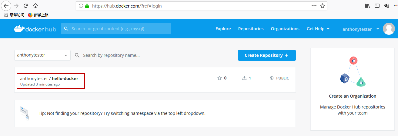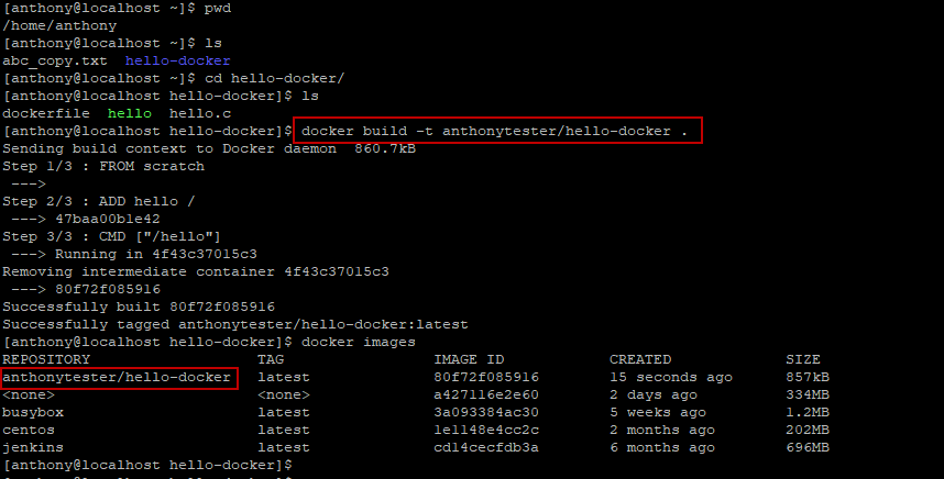 这个错误是访问拒绝,到底是什么原因呢,第一个原因是没有登录,第二个原因原因就出在REPOSTORY这里,发现没有上面图红圈我制作出来的镜像的REPOSITORY的名称是anthony/hello-docker,问题就出在anthony,因为我在hub.docker.com上面注册的账号昵称是anthonytester,所以我们重新通过Dockerfile来build一个叫做anthonytester/hello-docker的镜像。