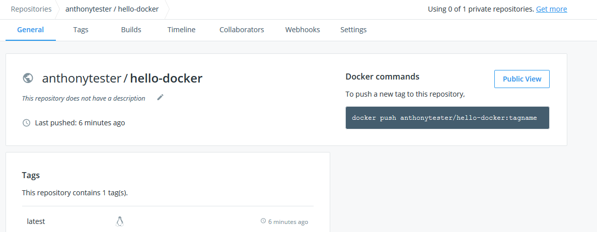如果你看到你账号下也有类似的push之后的镜像,说明你发布镜像成功了。点击这个镜像,看看它的详情页。