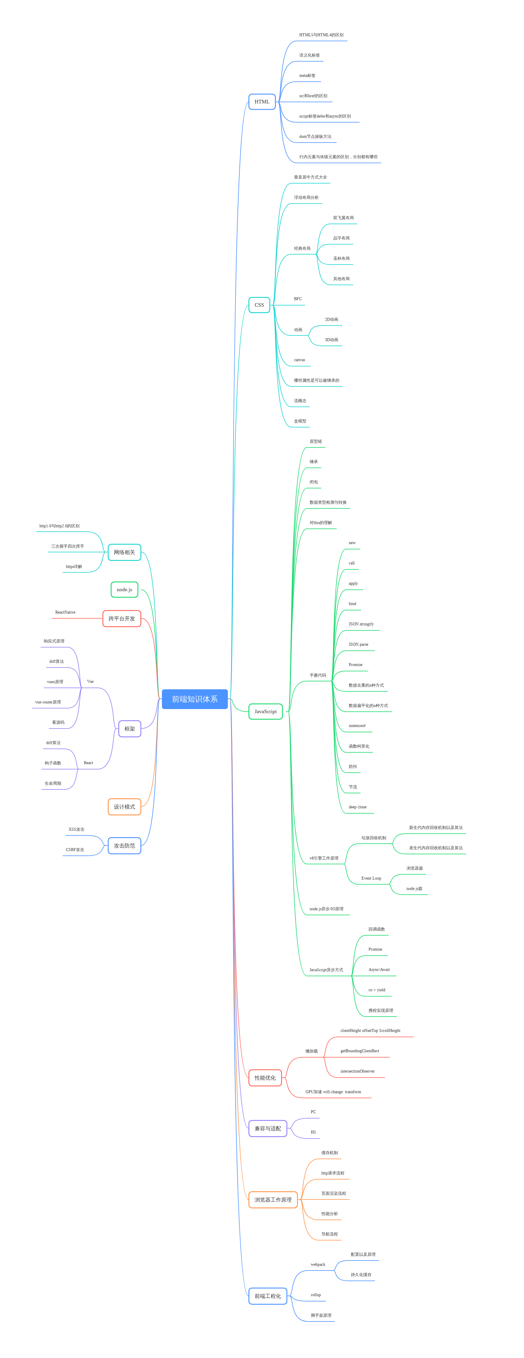 下面是目前制定的一份简单粗略的知识体系脑图,虽然里面的大部分都已经点亮,但是作者所知还是甚少,而且如果细细回想,还是会有种提笔忘字的感觉,还是要重新整理一份相关文章,加深理解与记忆,后面还会慢慢增加前端知识体系树干的枝叶,扩大知识体系,作者的危机感还是挺强额,对于自身的原地踏步是极难容忍的,希望能记录自己成长的足迹,多年后不因荒度光阴而捶胸顿足。