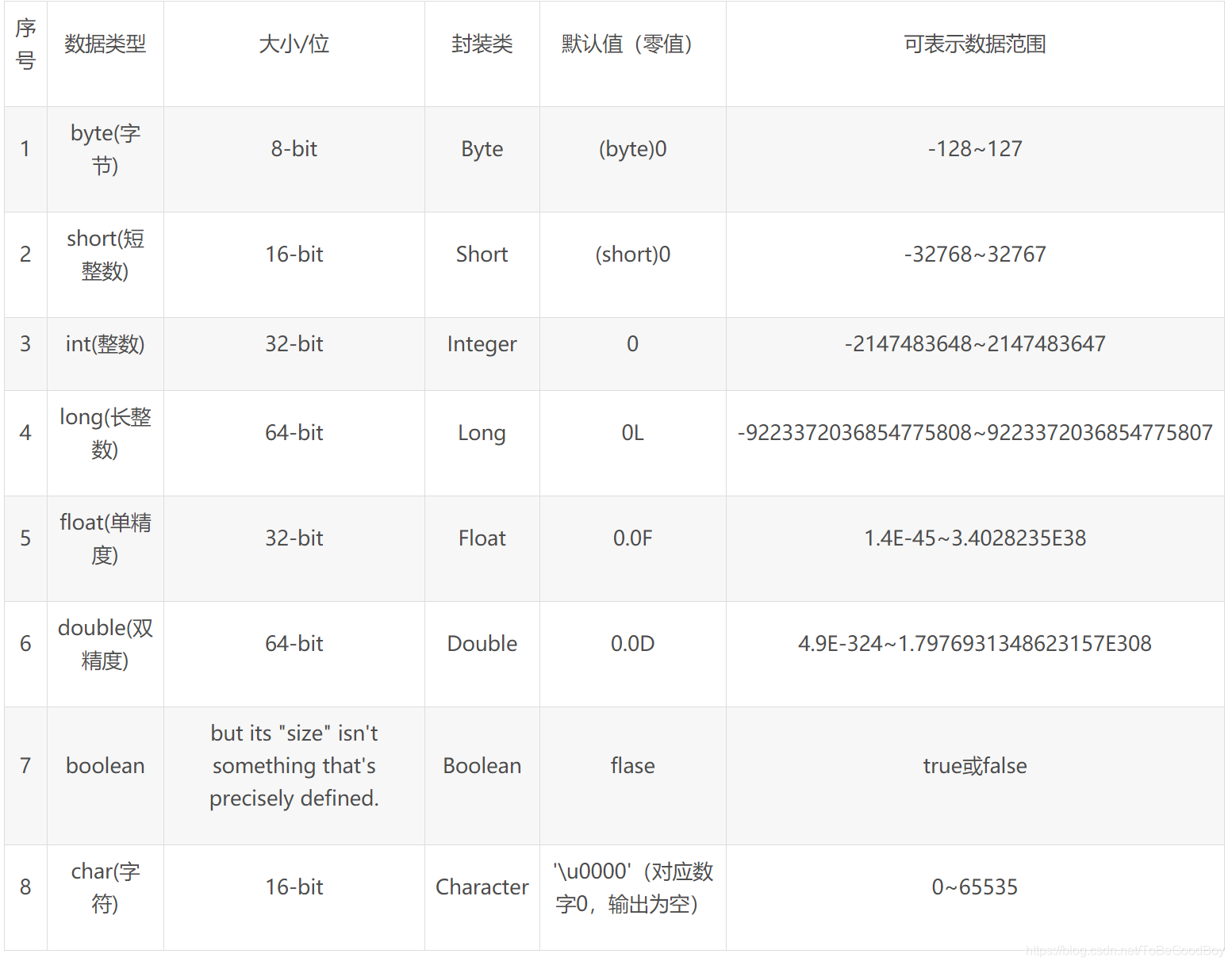 Java基本类型共有八种,基本类型可以分为三类,字符类型char,布尔类型boolean以及数值类型byte、short、int、long、float、double。数值类型又可以分为整数类型byte、short、int、long和浮点数类型float、double。JAVA中的数值类型不存在无符号的,它们的取值范围是固定的,不会随着机器硬件环境或者操作系统的改变而改变。实际上,JAVA中还存在另外一种基本类型void,它也有对应的包装类 java.lang.Void,不过我们无法直接对它们进行操作。