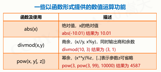 - pow(x,y)函数:计算 x y ,整数无限制,想算多大算多大