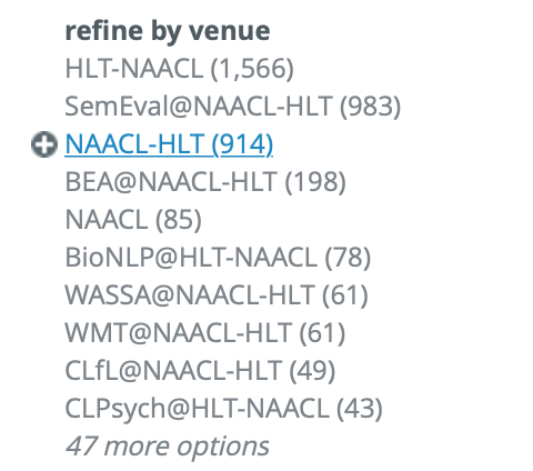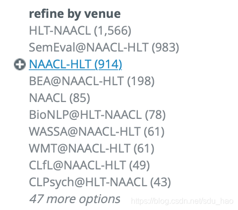 1)对于每个年份和关键词,构造dblp查询url。可以单独把会议信息作为一个查询条件放在url的venue字段中,但是这样做有个缺点,就是有些会议可能和其他会议联合召开,会有不同的venue名称,此时需要爬取多次,每次填入一个venue名称,如NAACL就有多个venue名称: