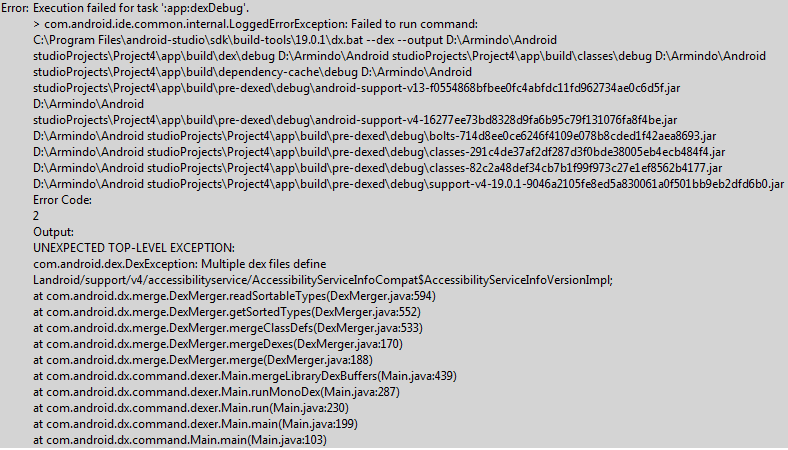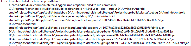 - What went wrong: Execution failed for task ':app:dexDebug'. com.android.ide.common.internal.LoggedErrorException: Failed to run command: C:\Program Files\android-studio\sdk\build-tools\android-4.4.2\dx.bat --dex --output D:\Armindo\Android studioProjects\Project4\app\build\dex\debug D:\Armindo\Android studioProjects\Project4\app\build\classes\debug D:\Armindo\Android studioProjects\Project4\app\build\dependency-cache\debug D:\Armindo\Android studioProjects\Project4\app\build\pre-dexed\debug\android-support-v13-f0554868bfbee0fc4abfdc11fd962734ae0c6d5f.jar D:\Armindo\Android studioProjects\Project4\app\build\pre-dexed\debug\android-support-v4-16277ee73bd8328d9fa6b95c79f131076fa8f4be.jar D:\Armindo\Android studioProjects\Project4\app\build\pre-dexed\debug\bolts-714d8ee0ce6246f4109e078b8cded1f42aea8693.jar D:\Armindo\Android studioProjects\Project4\app\build\pre-dexed\debug\classes-291c4de37af2df287d3f0bde38005eb4ecb484f4.jar D:\Armindo\Android studioProjects\Project4\app\build\pre-dexed\debug\classes-82c2a48def34cb7b1f99f973c27e1ef8562b4177.jar D:\Armindo\Android studioProjects\Project4\app\build\pre-dexed\debug\support-v4-19.0.1-9046a2105fe8ed5a830061a0f501bb9eb2dfd6b0.jar Error Code: 2 Output: