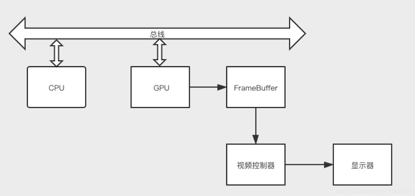 CPU拿到位图数据 ,然后通过总线发送给GPU,GPU做图层渲染,然后将渲染的结果保存在帧缓冲区(FrameBuffer)里面,在由视图控制器根据VSync信号在适应的时机将帧缓冲区里面的内容给到显示器。