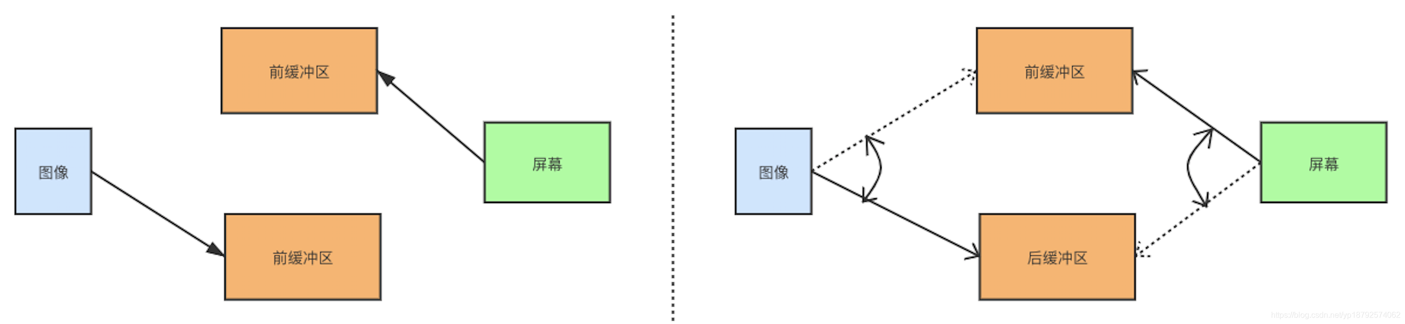 最简单的情况下,帧缓冲区只有一个,那么这个时候帧缓冲区的读取和刷新都会有很大的效率问题,为了解决效率问题,通常会引入两个缓冲区,这个时候一个缓冲区用于视频控制器的读取,被称为前缓冲区,另外一个缓冲区用于数据的存放,称为后缓冲区,等每次渲染完毕之后,前缓冲区变后缓冲区,后缓冲区变前缓冲区。这里用一幅别人的图