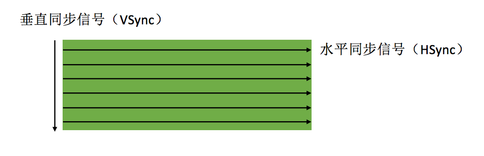 屏幕图像的显示原理要从CRT(阴极射线显像管)显示器说起,CRT显示器是靠电子束激发屏幕内表面的荧光粉来显示图像的,CRT的电子枪从上到下逐行扫描,扫描完成后就呈现一幅图像。然后电子枪在回到开始的位置进行下一次扫描。为了同步显示器的显示过程和视频控制器的控制过程,显示器会用硬件时钟产生一系列的定时信号,当电子枪换行进行扫描的时候,会发出一个水平同步信号,简称HSync,当一幅画面从上到下绘制完成后,电子枪恢复到开始位置,准备画下一帧前,会发出一个垂直同步信号,简称VSync。显示器都有刷新频率,这个刷新率就是VSync信号产生的频率。