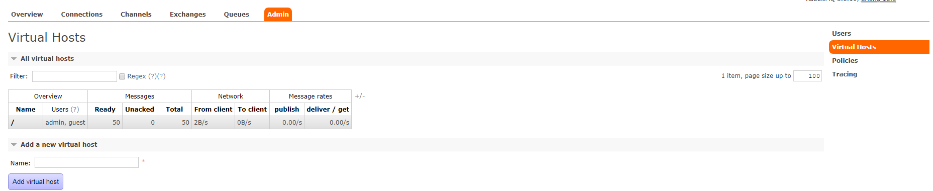 vhost:在前面的一篇文章《RabbitMQ的配置文件说明》中提到过一个关于vhost的默认配置为default_vhost = /,它代表一个mini的rabbitmq虚拟主机,除了与其他rabbitmq虚拟主机共享相同的身份认证和加密环境外,它拥有自己独立的queue,exchange,routingkey,binding及权限机制,它可以通过命令行rabbitmqctl add_vhost qa1和在管理界面添加