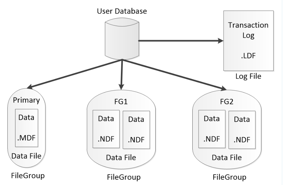 (1)数据文件用于保存数据库对象数据。数据库必须至少有一个主文件组(Primary),而用户定义的文件组则是可选的。Primary文件组包括 主数据文件(.mdf),以及数据库的系统目录(catalog)。可以选择性地为Primary增加多个辅助数据文件(.ndf)。用户定义的文件组只能包含辅助数据文件。