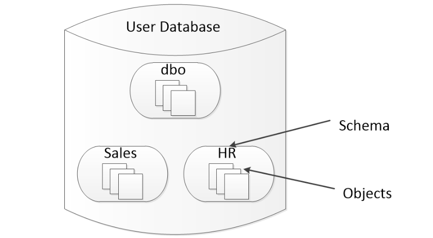 一个数据库包含多个架构,而每个架构又包括多个对象。可以将架构看作是各种对象的容器,这些对象可以是表(table)、视图(view)、存储过程(stored procedure)等等。