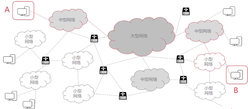 (2)Traceroute封装TTL=2的报文,从A到中型网络1再到大型网络时TTL=0,然后大型网络会向A发送ICMP差错不可达报文,A把大型网络的IP地址记录下来。