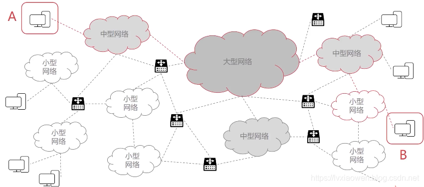 (3)Traceroute封装TTL=3的报文,从A到中型网络1到大型网络再到中型网络2时TTL=0,然后中型网络2会向A发送ICMP差错不可达报文,A把中型网络2的IP地址记录下来。