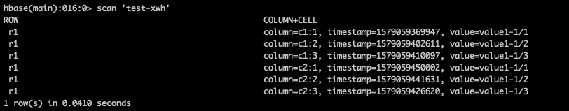3)表中添加数据: put 'test-xwh','r1','c1:1','value1-1/1'
