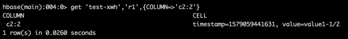 5) 获取表中的指定数据: get 'test-xwh','r1',{COLUMN=>'c2:2'}