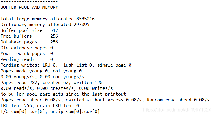 在上图中的数据中,我们可以看到倒数第二行两个参数LRU len:256,unzip_LRU len:0,这两个参数分别表示由LRU管理的总页数,而在innoDB引擎从1.0版本之后支持压缩页的功能,会将原本16kb的页压缩为1kb、2kb、4kb和8kb,而这部分压缩后的页则是由unzip_LRU进行管理的,但是LRU len的数量是包含unzip_LRU的数量的。