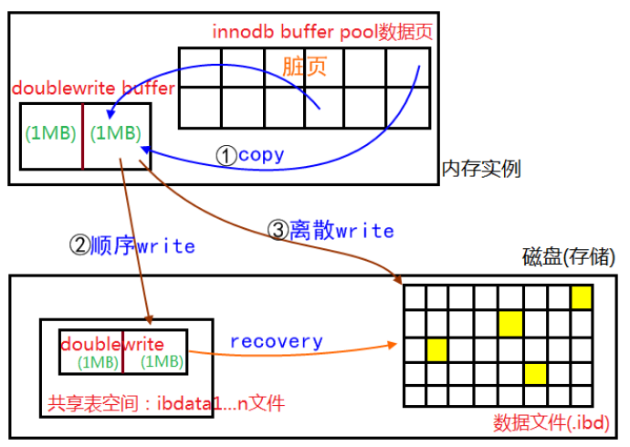 在对缓冲池的脏页进行刷新时,并不直接写磁盘,而是会通过 memcpy函数将脏页先复制到内存中的 doublewrite buffer,之后通过 doublewrite buffer再分两次,每次1MB顺序地写入共享表空间的物理磁盘上,然后马上调用 fsync函数,同步磁盘,避免缓冲写带来的问题。在这个过程中,因为 doublewrite页是连续的,因此这个过程是顺序写的,开销并不是很大。在完成 doublewrite页的写入后,再将 doublewrite buffer中的页写入各个表空间文件中,此时的写入则是离散的。