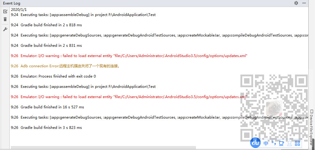 Emulator: I/O warning : failed to load external entity "file:/C:/Users/Administrator/.AndroidStudio3