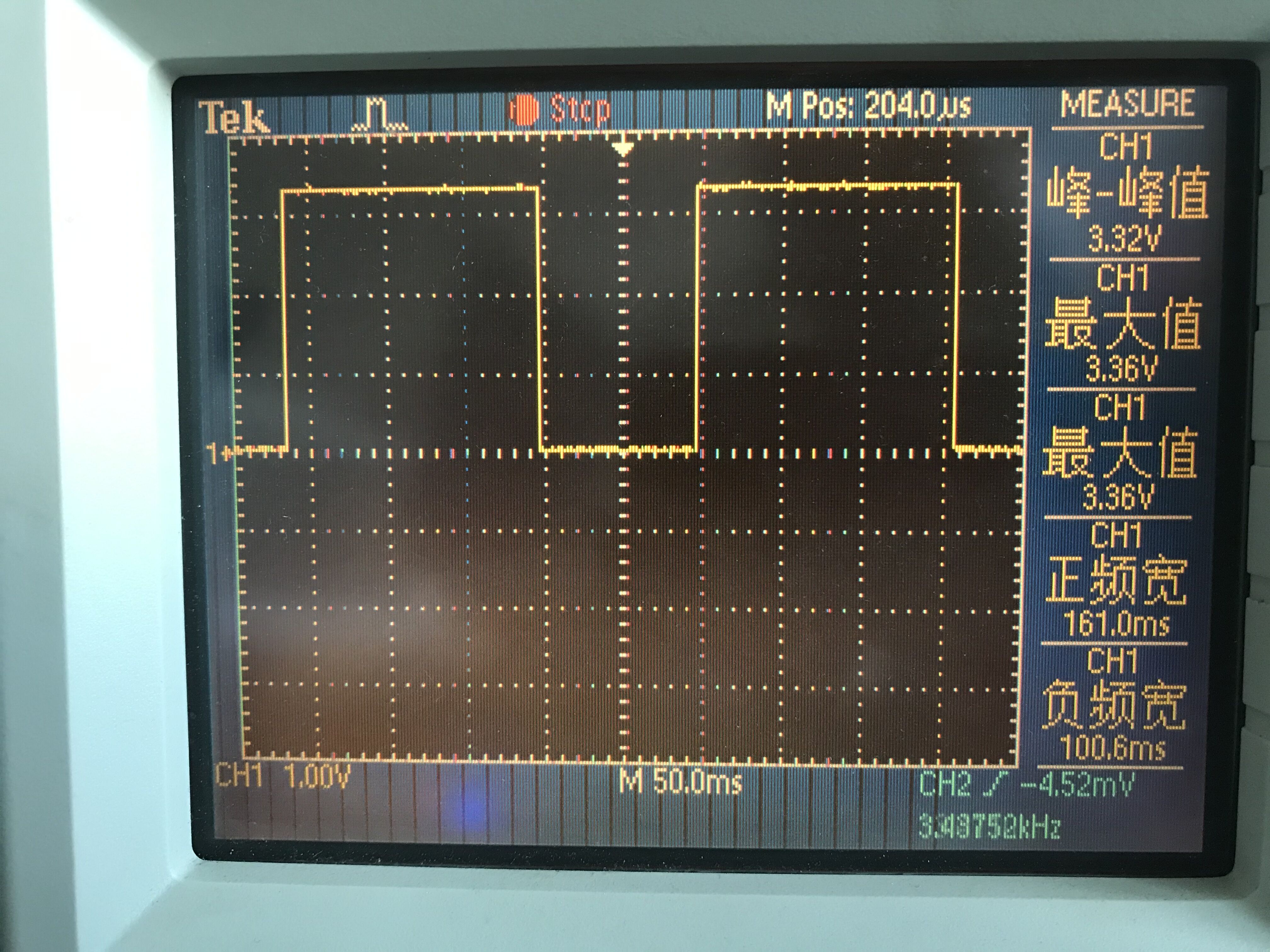 通过示波器能观察到高电平延时了160ms,低电平延时了100ms。