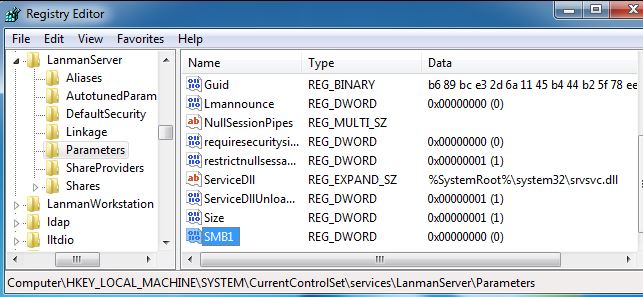 HKEY_LOCAL_MACHINE \ SYSTEM \ CurrentControlSet \ Services \ LanmanServer \ Parameters