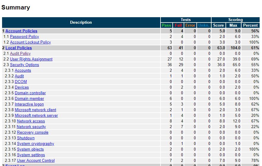 这是CIS Securesuite工具的屏幕截图。它在我的计算机上进行了扫描,并生成了有关通过和失败的所有设置的报告。