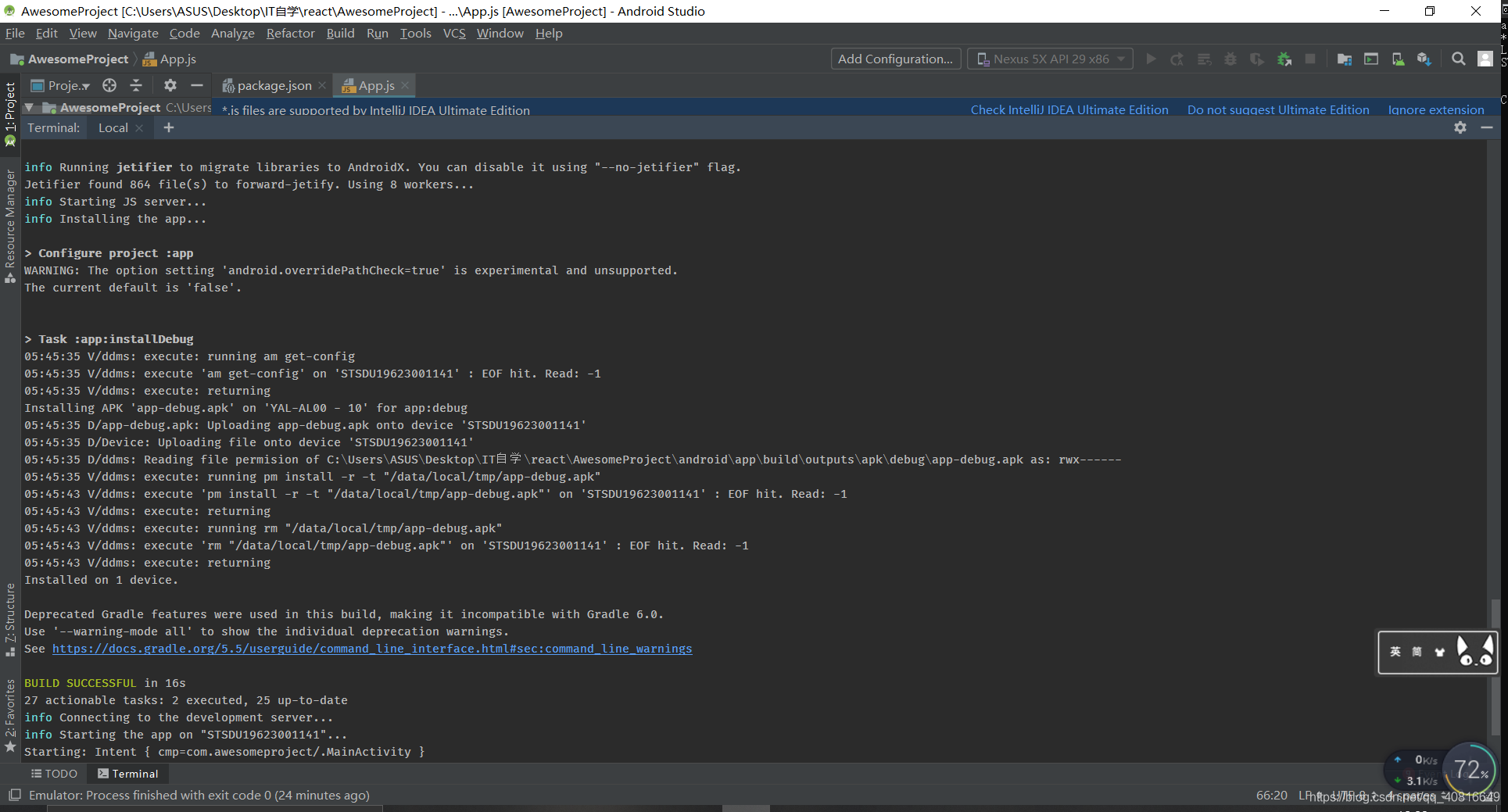 在android studio的命令行中输入npm run android见到如下截图即为成功这时候你要在手机设备上允许安装app。