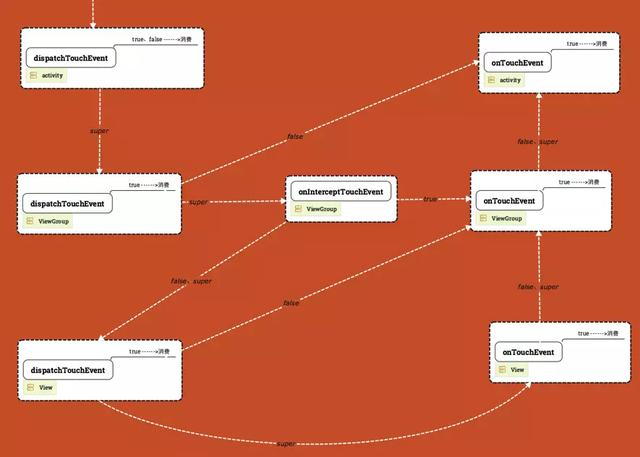 - dispatchTouchEvent和 onTouchEvent的框里有个【true---->消费】的字,表示的意思是如果方法返回true,那么代表事件就此消费,不会继续往别的地方传了,事件终止。