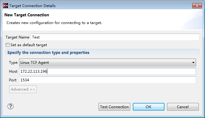 弹出窗口的 Target Setup 页 Connection 项选择之前设置的 Linux TCF Agent(Test)