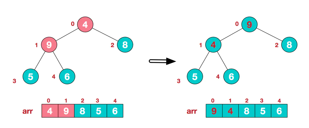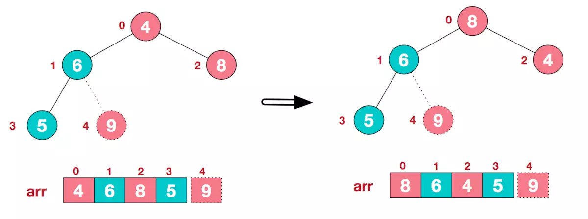 3.找到第二个非叶节点4,由于[4,9,8]中9元素最大,4和9交换。