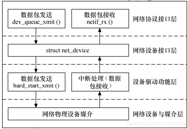 设备驱动功能层各函数是网络设备接口层 net_device 数据结构的具体成员,是驱使网络设备硬件完成相应动作的程序,它通过hard_start_xmit()函数启动发送操作,并通过网络设备上的中断触发接收操作
