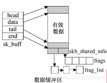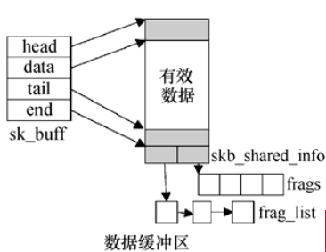 Linux 内核必须分配用于容纳数据包的缓冲区, sk_buff 结构体定义了 4 个指向这片缓冲区不同位置的指针 head、 data、 tail 和 end。