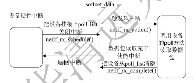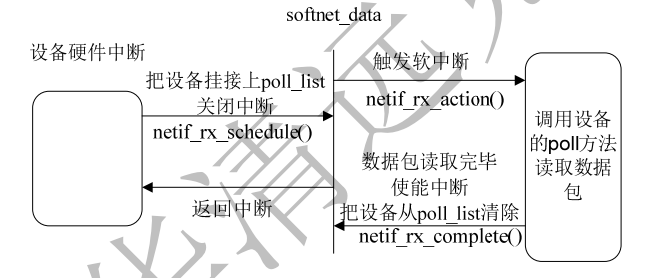 虽然 NAPI 兼容的设备驱动以 poll 方式接收数据包,但是仍然需要首次数据包接收中断来触发 poll 过程。与数据包的中断接收方式不同的是,以轮询方式接收数据包时,当第一次中断发生后,中断处理程序要禁止设备的数据包接收中断,如代码清单所示: