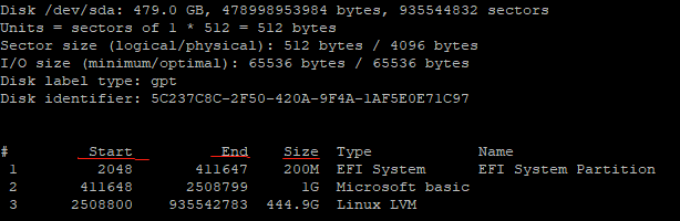 上图中,Disk /dev/sda表示硬盘/dev/sda,该硬盘有3个分区,Start表示磁盘分区起始点,End表示磁盘分区的结束点,Size表示该分区的大小。如果不存在红线处的信息,说明该硬盘尚未分区。