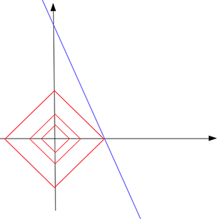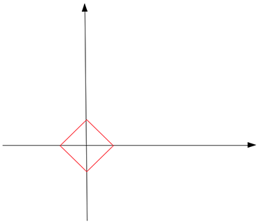 把红色的正方形与蓝色的线放在一个图像上就能清晰的发现,他们相交的在坐标轴上的点恰好满足稀疏性的要求,也能使得
