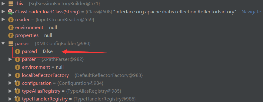 /** * 使用xml解析器去解析mybatis 配置文件信息 */ public class XMLConfigBuilder extends BaseBuilder { private boolean parsed; //xml解析器 private XPathParser parser; .... //第一步进入到这个带参数的构造方法中 public XMLConfigBuilder(Reader reader, String environment, Properties props) { //调用具体的执行逻辑方法,点进去,进入重载的方法 this(new XPathParser(reader, true, props, new XMLMapperEntityResolver()), environment, props); } .... //第二步执行具体逻辑 private XMLConfigBuilder(XPathParser parser, String environment, Properties props) { super(new Configuration()); ErrorContext.instance().resource("SQL Mapper Configuration"); this.configuration.setVariables(props); //在构造函数设置了parsed 为fasle this.parsed = false; this.environment = environment; this.parser = parser; }