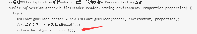 /* *创建 SqlSessionFactory */ public class SqlSessionFactoryBuilder { //第一步进入这个方法,Reader读取mybatis配置文件,传入构造方法 public SqlSessionFactory build(Reader reader) { //调用重载的方法,我们点进去 return build(reader, null, null); } ....省略部分源码 //第二步进入这个重载方法 public SqlSessionFactory build(InputStream inputStream, String environment, Properties properties) { try { //通过XMLConfigBuilder解析mybatis配置文件,源码分析 XMLConfigBuilder parser = new XMLConfigBuilder(inputStream, environment, properties); //源码分析 return build(parser.parse()); ...省略部分源码 }下面就接着看看 XMLConfigBuilder 源码片段:具体如何解析配置文件的,是通过xml解析器去解析配置文件