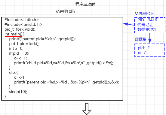 (1)程序启动时,系统加载程序,为变量分配内存,为父进程创建进程控制块PCB,并在其中填写分配给该进程的PID(此处为3416)、代码地址、数据集地址和其他属性,在进程数据集中x和PID的内容不定。