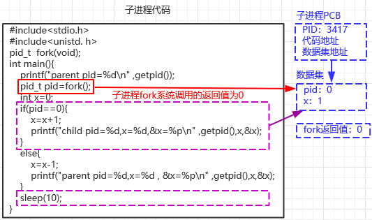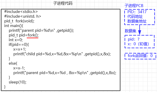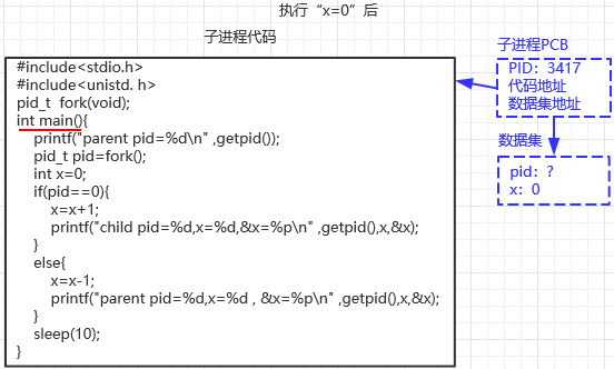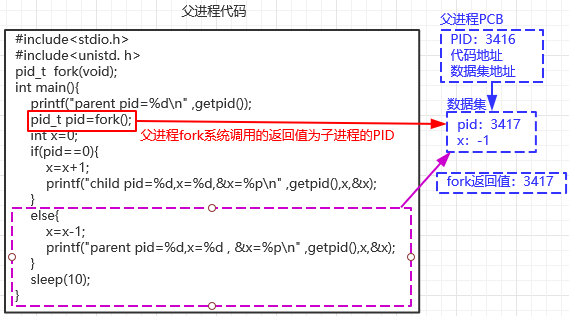 ①fork系统调用完成子进程的创建后,父子进程都有相同的程序代码,从函数调用返回开始往下执行,从数据集中读取fork返回值,赋值给pid变量,因此父进程的pid变量被写入3417,子进程的pid变量被写入0;