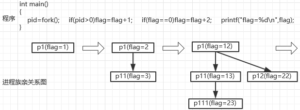 (4)条件pid>0为真的进程p1和p11将flag加10变成12和13;条件pid==0为真的进程p12和p111将flag加20变成22和23。