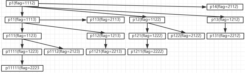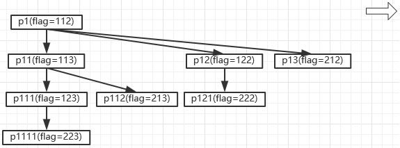 新的子进程p13:flag=12+200=212 p112:flag=13+200=213 p121:flag=22+200=222 p1111:flag=23+200=223