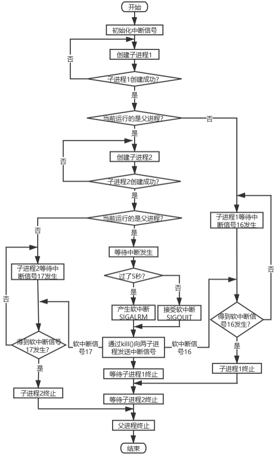 (5)如果当前运行的是父进程,则一起随眠5秒,再分别向子进程1和2发送中断信号16和17,父进程调用wait()函数等待两个子进程终止后,输出“Parent process is killed!!”,结束进程执行。