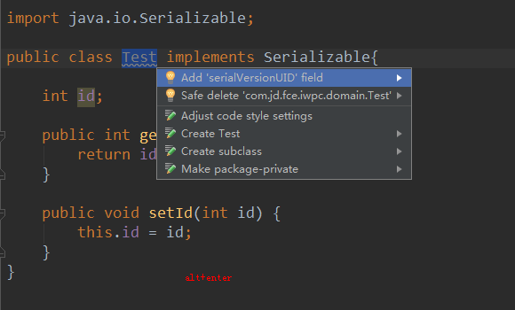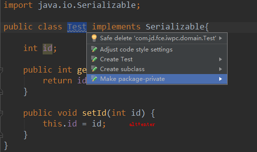 3:设置之后,选中对应的类名,然后按 alt+enter 快捷键 的情况如下所示