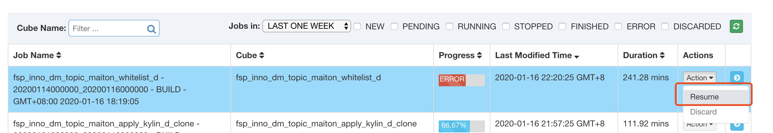 kylin执行构建如果因为OOM等原因运行失败后,调整配置参数,无需从头开始构建,kylin有个牛x的功能叫恢复执行,可以从失败的阶段开始重新执行,笔者之前不知道有这个功能,都是重头开始构建,执行到失败的步骤运行时间又很长,试错成本特别高。