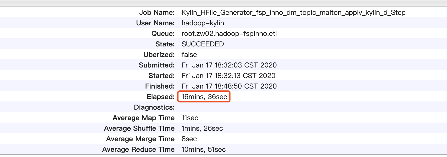 优化kylin.hbase.region.cut=2,kylin.hbase.region.count.min=2后执行时间从 50m降到16m。